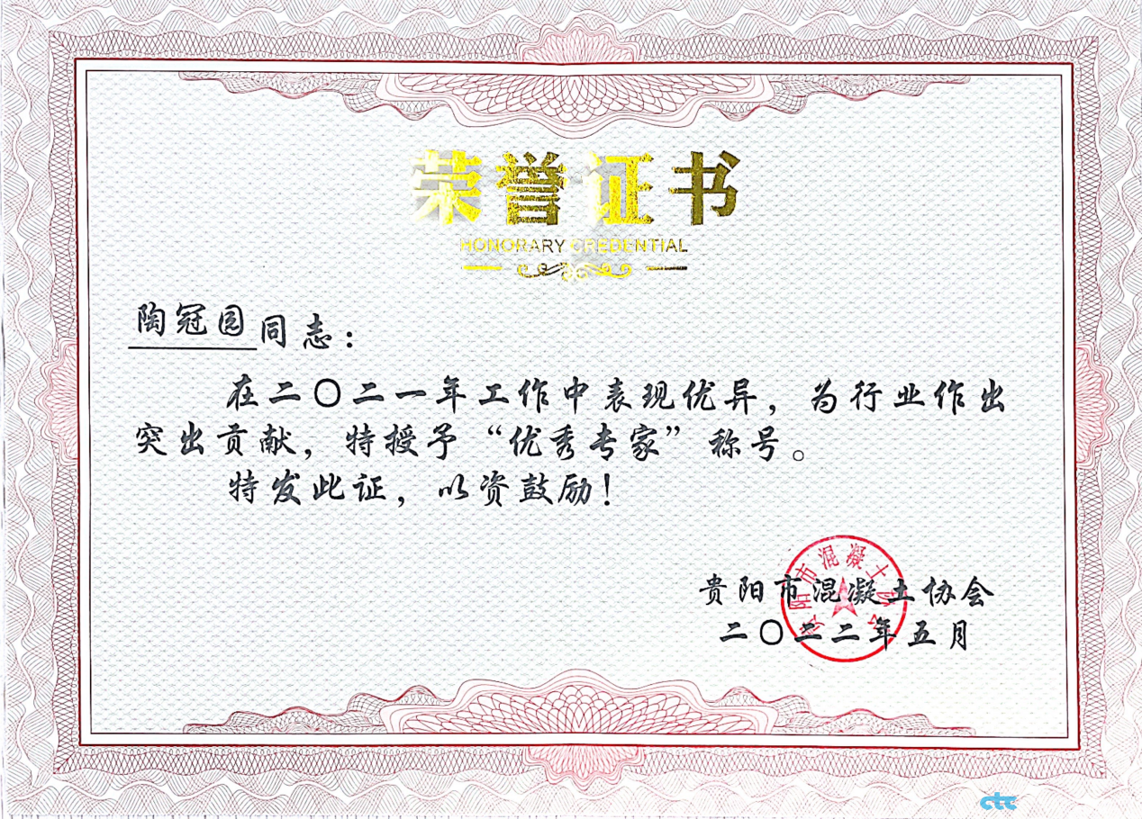 2022年5月30日下午,由貴陽(yáng)市混凝土協(xié)會(huì)召開(kāi)的貴陽(yáng)市預(yù)拌混凝土行業(yè)實(shí)驗(yàn)等級(jí)評(píng)定工作總結(jié)會(huì)上,我司員工朱若君、陶冠園在參與貴陽(yáng)市混凝土企業(yè)專項(xiàng)實(shí)驗(yàn)室等級(jí)評(píng)定工作中被貴陽(yáng)市混凝土協(xié)會(huì)授予“2021年度優(yōu)秀專家”榮譽(yù)稱號(hào)。